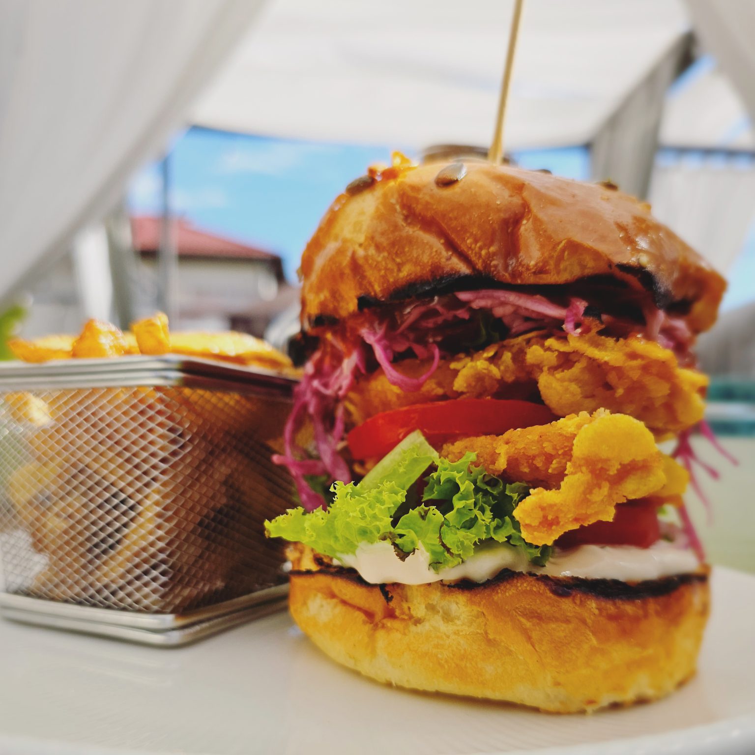 Chiflă, carne de vită, cheddar, salată, roșii, castraveți în oțet, ceapă, sos Agora (maioneză, ketchup, castraveți murați, lămâie) cartofi prajiti (500 g)